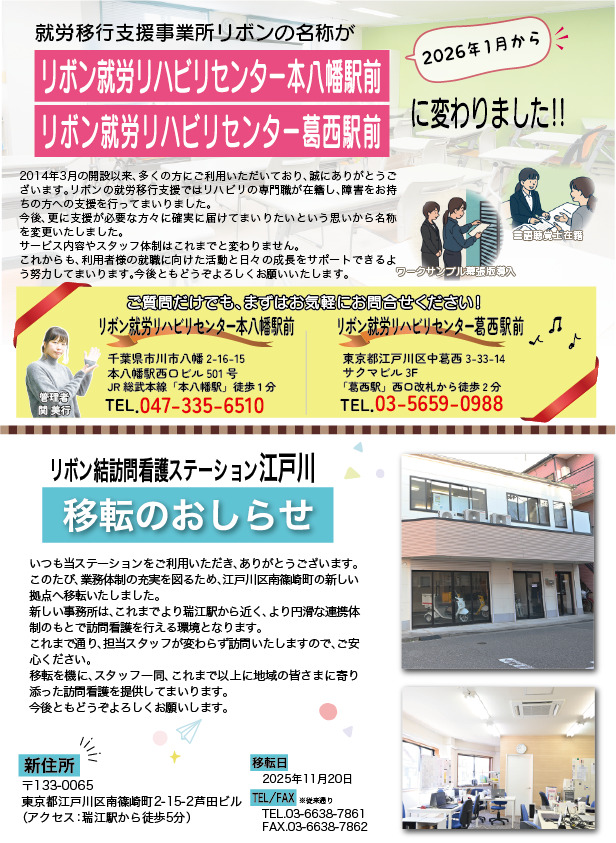 リボン結訪問看護ステーション江戸川の移転についてお知らせをしています。