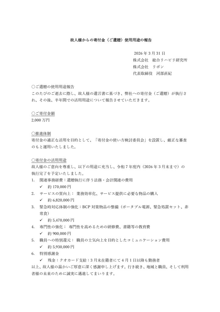 この度、故利用者様のご遺志に基づき受領いたしました寄付金につきまして、