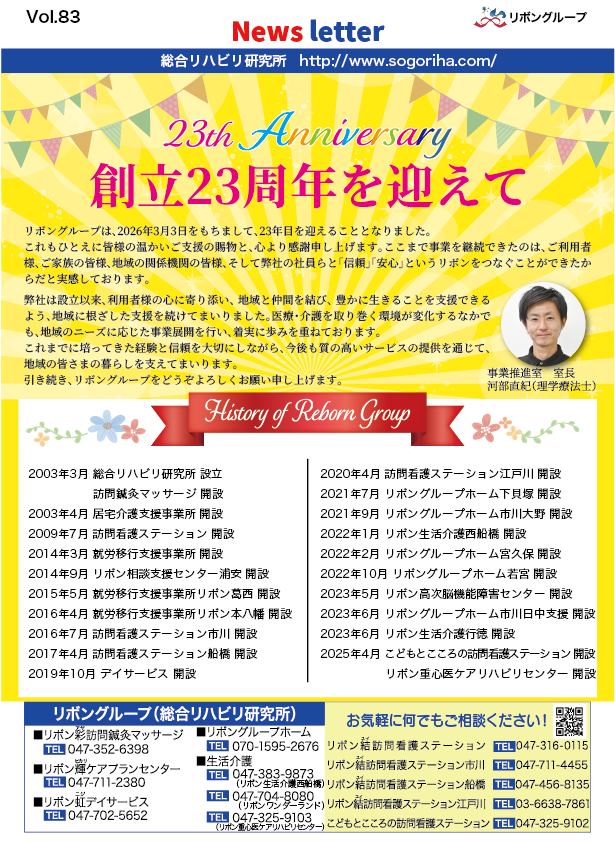 総合リハビリ研究所のニュースレター4月号(Vol.83)が発行されました。